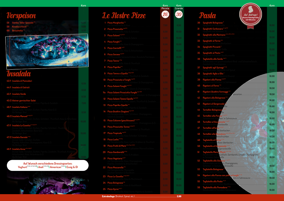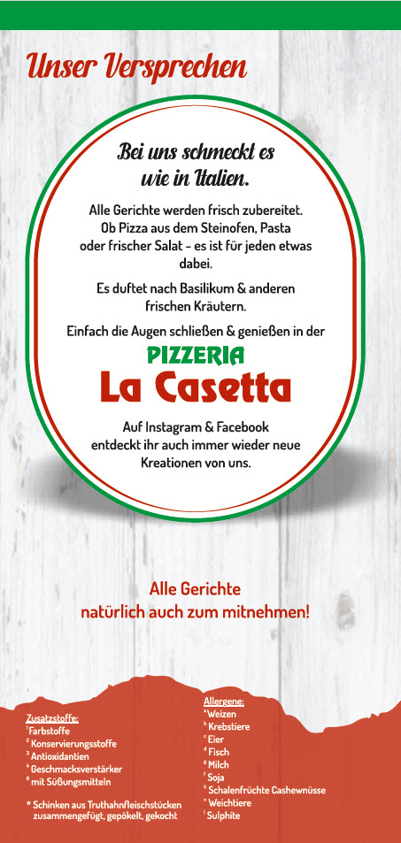 In conclusion, the menu at Pizzeria La Casetta offers a satisfying mix of classic comfort and hearty specialties, making it a reliable choice for anyone craving traditional pizzeria flavors. Standout items like the Calzone Und Bacon and Pizza Bacon Spezial showcase rich, savory combinations that feel both indulgent and well-balanced, while the Knobibrot serves as a simple yet flavorful starter. Signature options such as the Manni Pizza and Pizza Nr 25 highlight the restaurant’s variety, and staples like Salami Mit Zwiebeln and Salami Pizza deliver exactly what fans of classic toppings expect. The Bruchetta Spezial adds a fresh and aromatic touch to the menu, and for those looking for something beyond pizza, the Hähnchen Gorgonzola Mit Pasta provides a creamy, satisfying alternative. Overall, the menu reflects a well-rounded selection that caters to both traditional tastes and those looking for something a little more special.